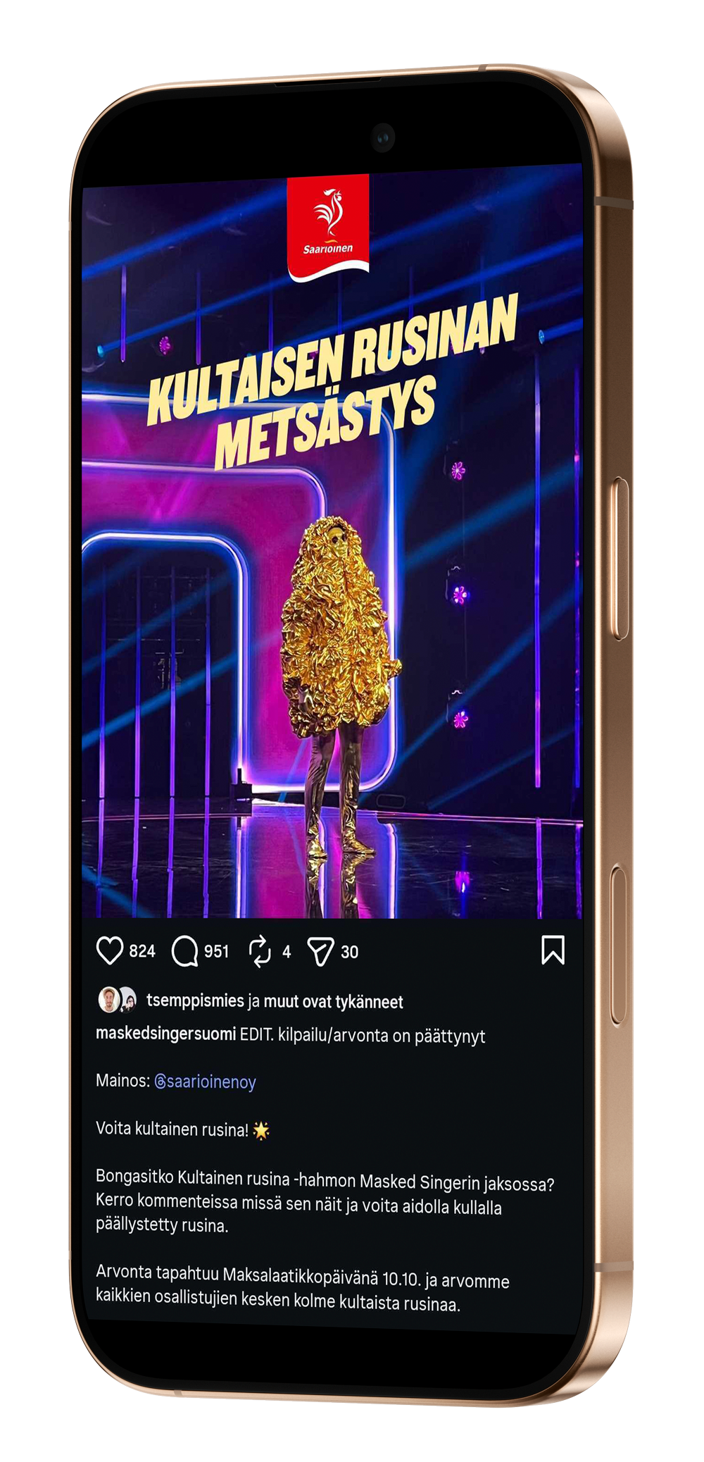 Siis rusina. Vaan ei mikä tahansa rusina vaan kultainen rusina. Sellaisia pistettiin piiloon peräti 21 kappaletta*. Ja koska Saarioisten maksalaatikko on koko Suomen juttu, rusinoita ei tietenkään voitu jemmata pariin paikkaan Helsingissä, vaan niiden piti olla helposti saatavilla pitkin Suomea. Niinpä keskeiseen rooliin nousivat digitaaliset kanavat, kuten TikTok-vaikuttajat, kampanjasivusto ja digitaaliset ulkomainokset. Kultaisen rusinan metsästys oli kampanjan sydän, mutta toki karnevalistinen meno sisälsi paljon muutakin – muun muassa upouuden kannatuslaulun.